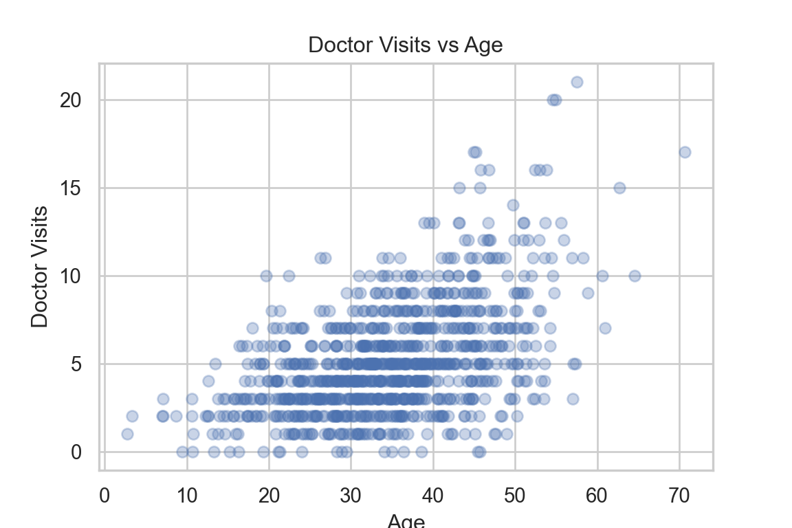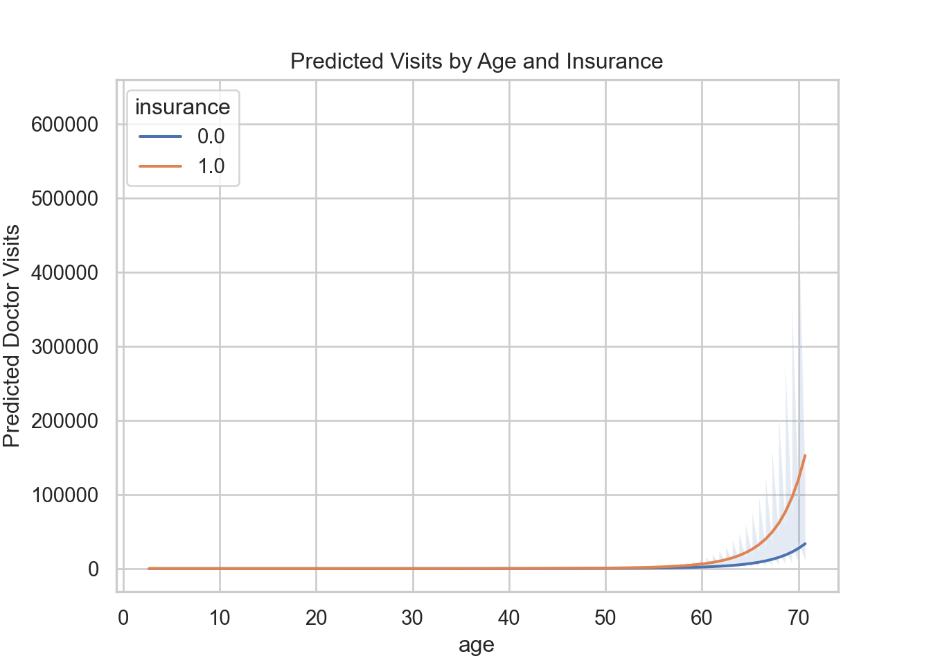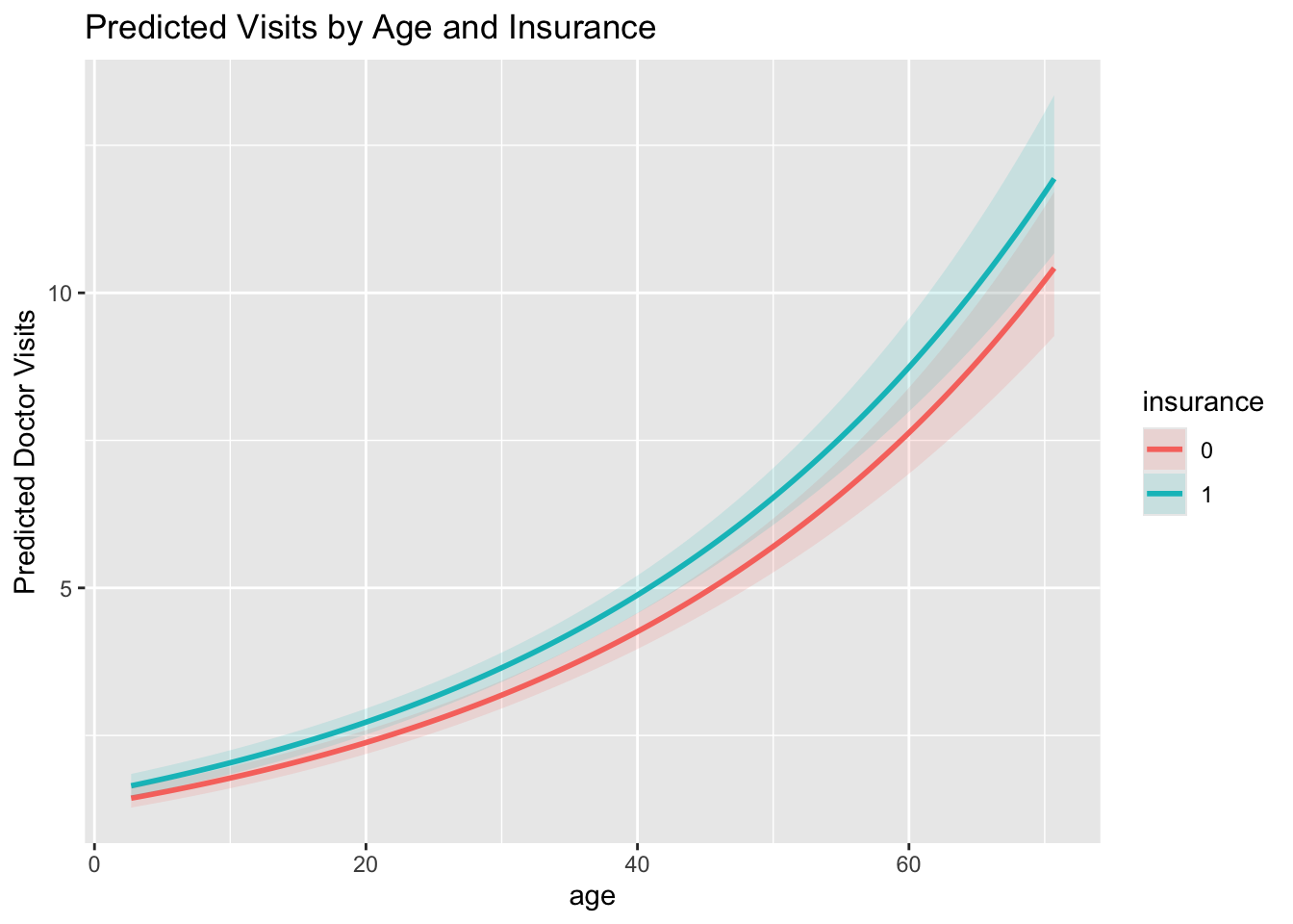 labs(y = "Predicted Doctor Visits", title = "Predicted Visits by Age and Insurance")