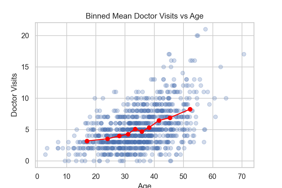 The Poisson regression analysis shows that doctor visitation increases systematically with age, education, insurance coverage, marital status, and urban residence. Within these, age and education show strong and precise positive associations, while having insurance coverage is associated with an increase in expected visits (vs being uninsured).