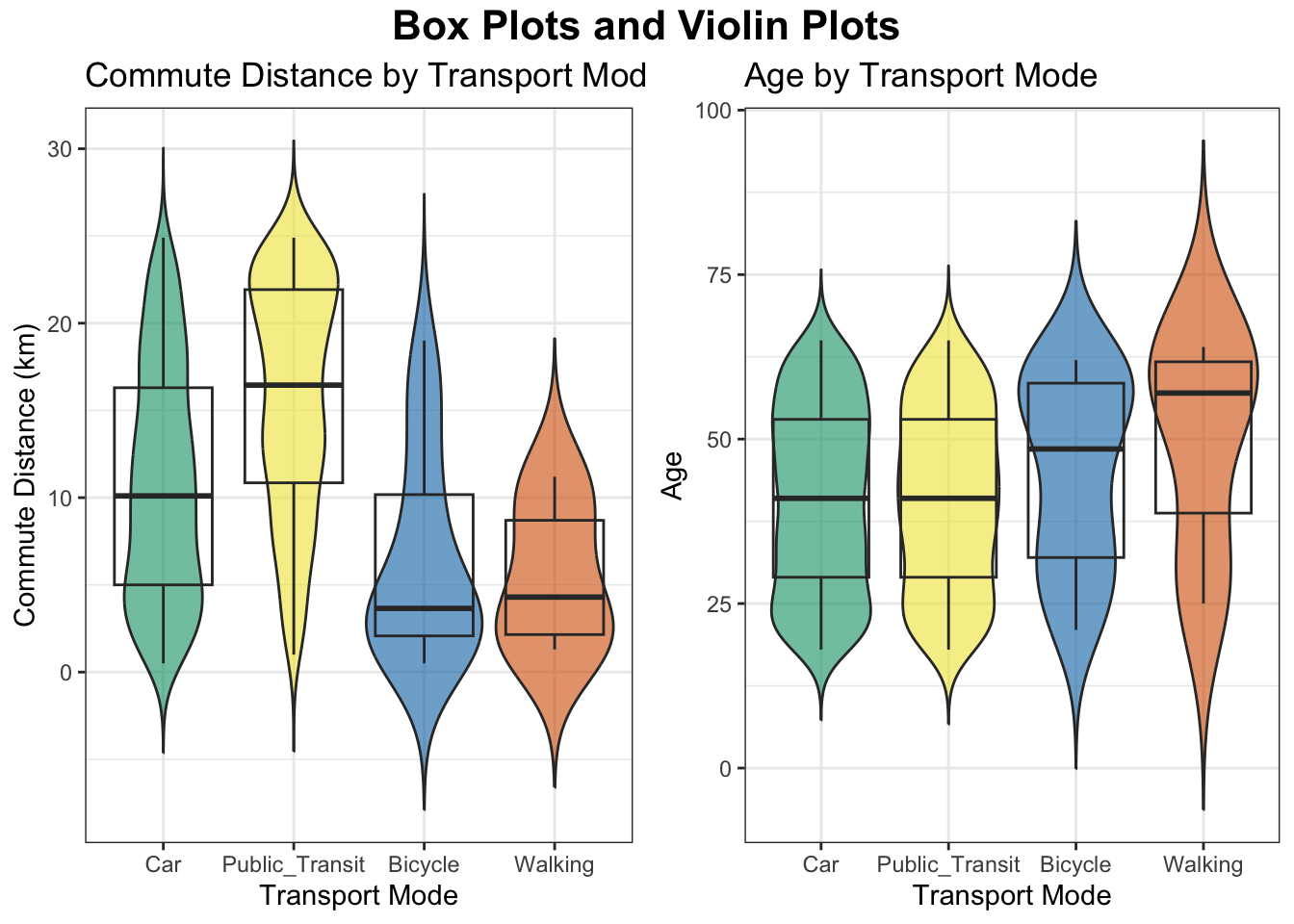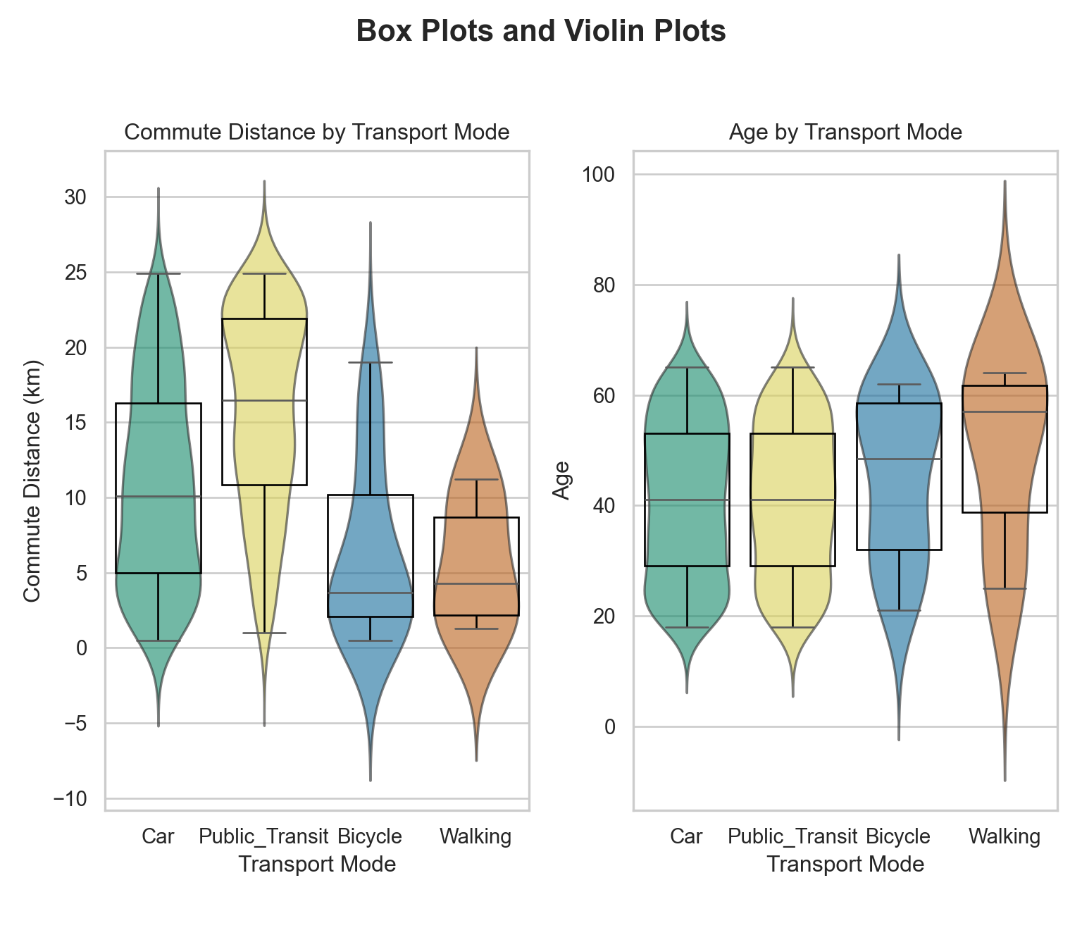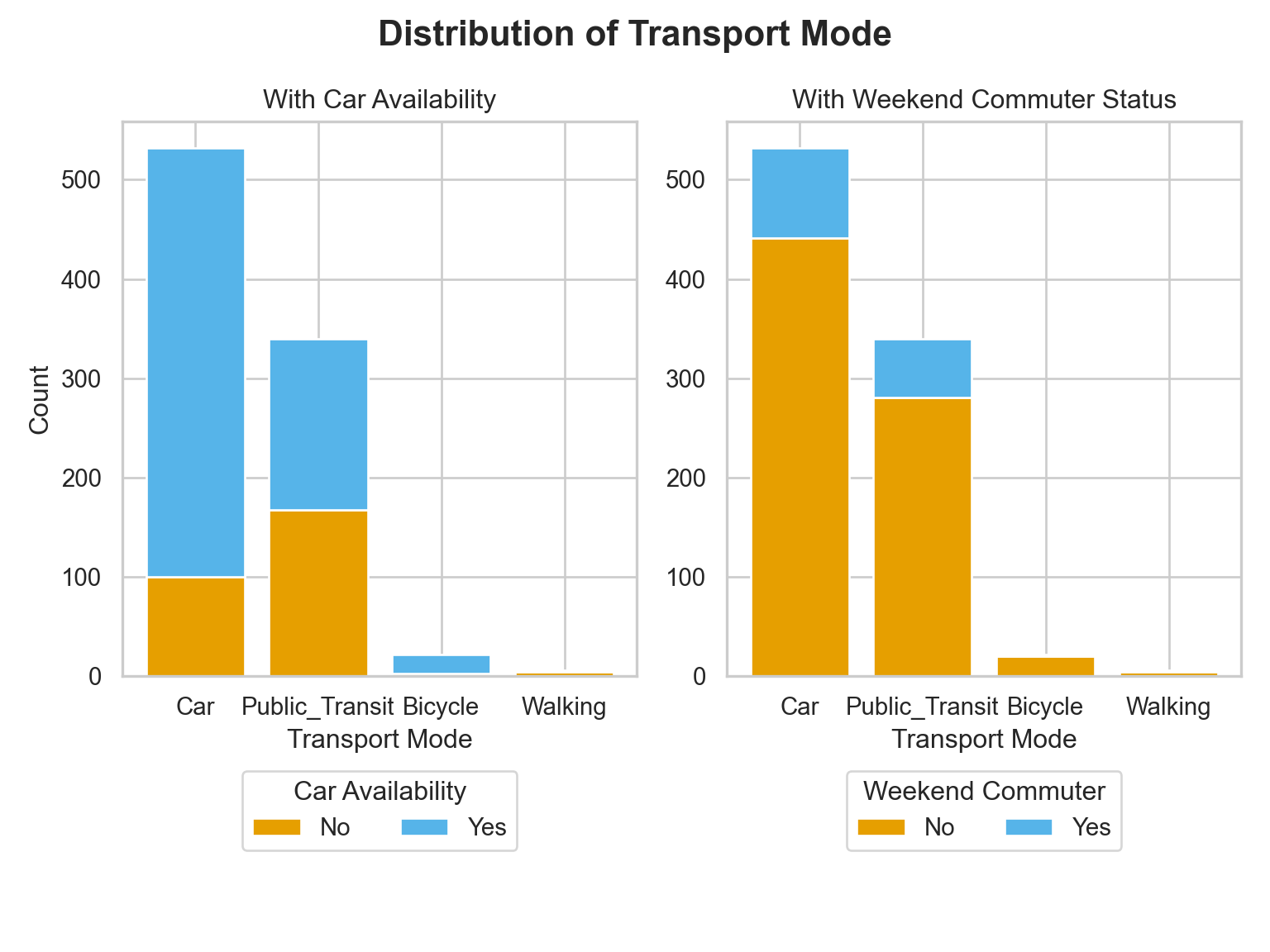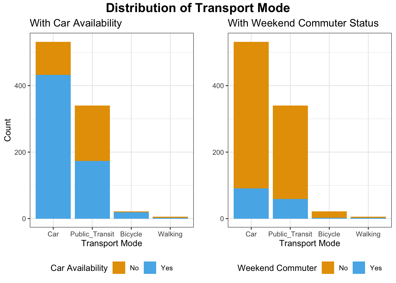 Commuting behaviors and demographic factors are both associated with transportation mode choice and useful for predicting the choice between choosing cars or public transportation. In general, prediction is stronger for more frequent modes. This inferential question provides a comprehensive understanding of how individual characteristics shape transportation decisions and the predictive question can guide planning or personalized recommendations. You may choose one perspective of either inferential or predictive depending on your research goal.