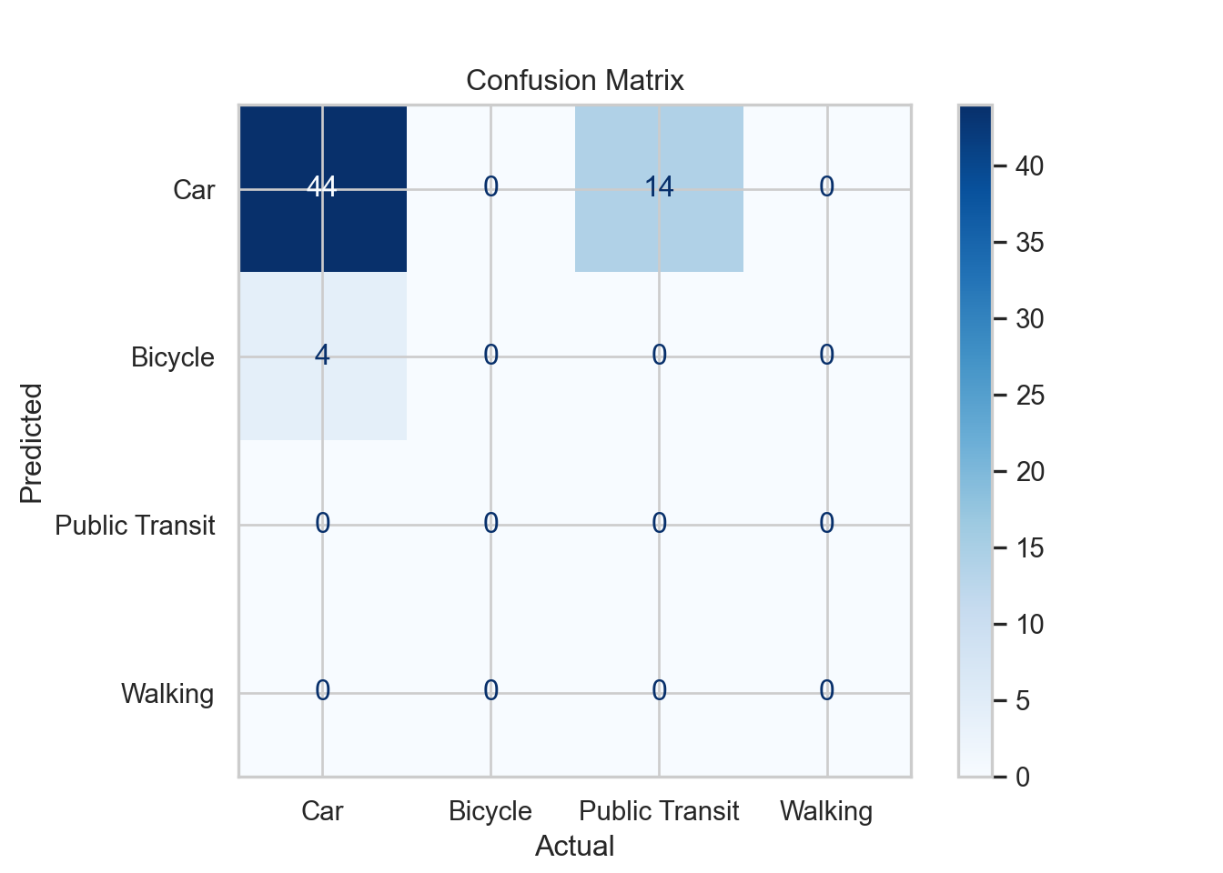 - Can we accurately predict the transportation mode of an individual based on their commuting behaviors and demographics including if they have a car, if they commute on weekends, their commute distance, and age?